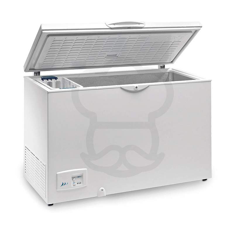 Arcón congelador tapa ciega abatible HC460 de 140 centímetros de largo. Congelador horizontal que combina un alto rendimiento frigorífico, su temperatura oscila entre los -18ºC a los -24ºC, con la eficiencia energética que le confiere el uso del gas R-600 de bajo impacto ambiental. El sistema de refrigeración es estático.