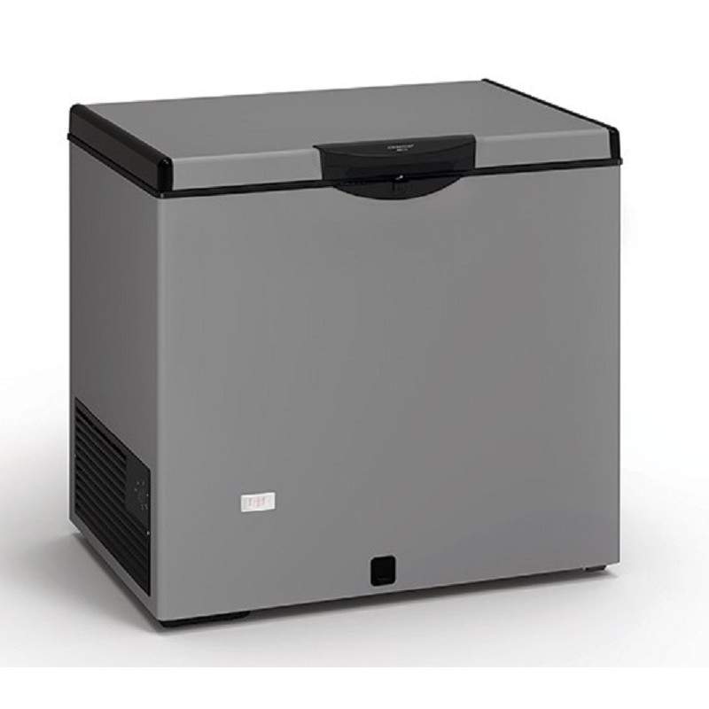 Arcón congelador gris de alta eficiencia con capacidad de 209L, y temperatura de trabajo entre -14 °C y -22 °C. Equipado con aislamiento de 65mm, gas ecológico R600a y bajo consumo energético (260 kWh/año). Ideal para tiendas, restaurantes y supermercados, ofrece gran durabilidad, movilidad con ruedas y control analógico fácil de usar.