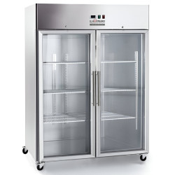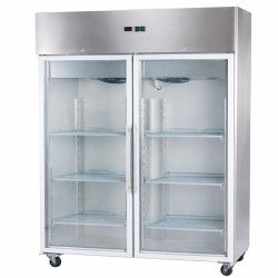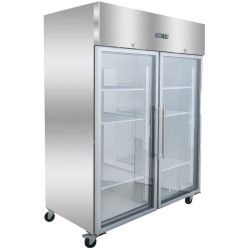 Frigorífico industrial de 1000 litros con 2 puertas de cristal para una exposición perfecta y acceso rápido. Fabricado en acero inoxidable, cuenta con termostato digital y sistema de descongelación automática para facilitar el mantenimiento. Ideal para hosteleros que buscan gran capacidad, visibilidad y rendimiento profesional.