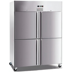 Nevera industrial de 1000 litros con 4 medias puertas, fabricada en acero inoxidable y diseñada para un uso profesional intensivo. Control digital de temperatura, cierre automático y estantes regulables. Alta eficiencia, gran capacidad y fiabilidad garantizada.