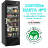 Su rango de temperatura oscila entre - 1 a +5°C permitiendo conservar las cervezas en 2°C de media. Este armario expositor permite combinar la exposición de cerveza muy fría con otros refrescos sin riesgo a que se congelen como ocurre en otras neveras subzero. La puerta es de doble acristalamiento con bisagras robustas especialmente diseñada para negocios de hostelería con aperturas muy frecuentes. La puerta de doble acristalamiento permite una perfecta visión interna al mismo tiempo que aísla el interior del armario.