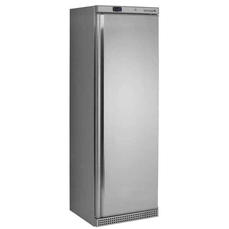 Congelador industrial vertical TEFCOLD UF400S de 400 litros, con acabado en acero inoxidable SS430 y interior de ABS alimentario. Cuenta con termostato electrónico, 6 estantes fijos y una pantalla digital para control de temperatura.