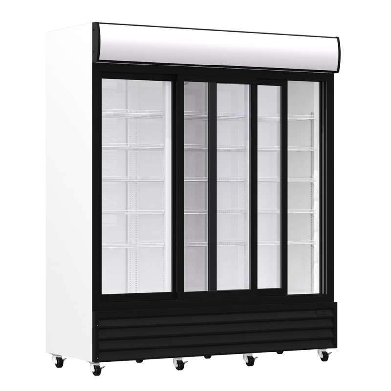 Nevera expositora vertical con tres puertas correderas. Ideal para exponer bebidas y alimentos refrigerados en tiendas de alimentos, supermercados, estaciones de servicio, restaurantes y hoteles.