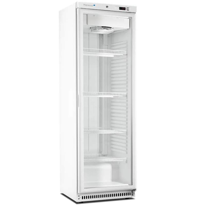 Vitrina nevera subcero con capacidad de 386 litros que ofrece un rango de temperatura de -3ºC a +1ºC, ideal para cerveza muy fria. Incluye termostato digital, descongelación automática y sistema superfrost de gestión de energía. Su diseño cuenta con bandejas ajustables y acabado en color blanco.
