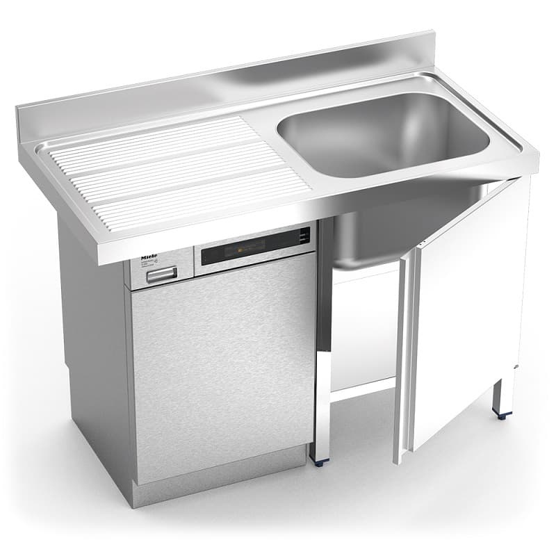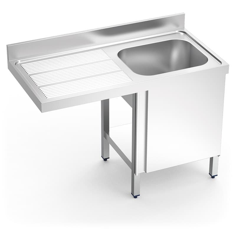 Fregadero de acero inoxidable con cubeta de 500x400x250 mm, escurridor lateral izquierdo y espacio para integrar un lavavajillas bajo encimera. Incluye un compartimento cerrado con puerta abatible para almacenamiento, ideal para cocinas profesionales. Resistente, fácil de limpiar y optimiza el espacio, especialmente en restaurantes y colectividades.