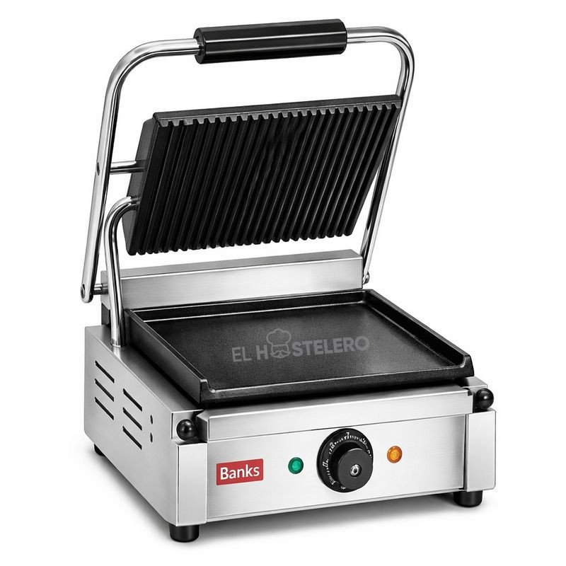 Parrilla eléctrica de contacto pequeña BANKS CTG370E, es perfecta para cafeterías, pubs, restaurantes y bocaterías, con un rango de temperatura ajustable entre 50ºC y 300ºC. Su superficie de acero es fácil de limpiar y cuenta con un peto contra salpicaduras de 30 mm para mayor seguridad.