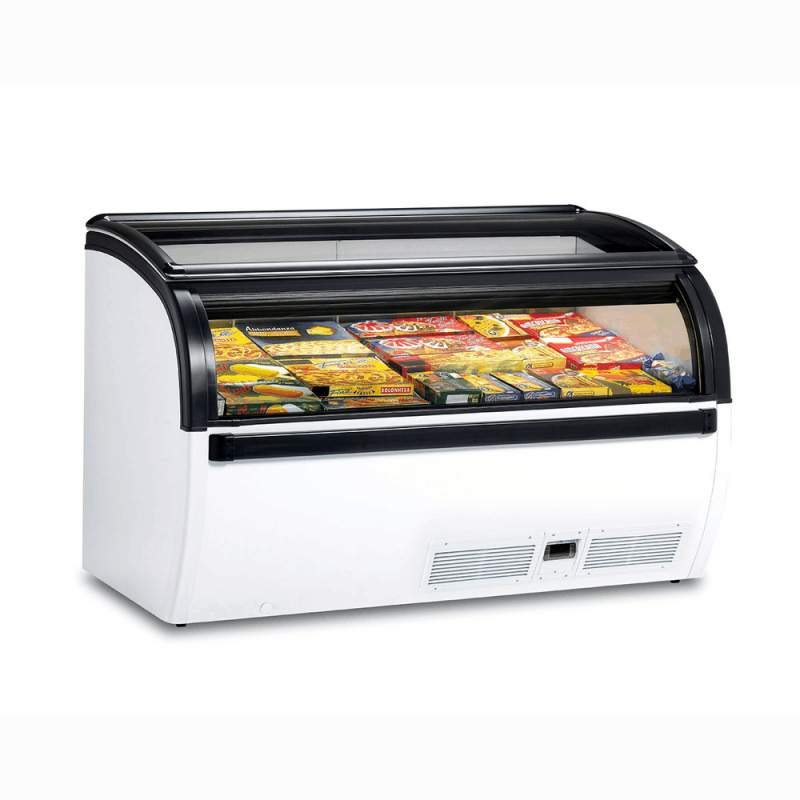 Isla de congelación con diseño muy atractivo y modulable. Excelente presentación para los alimentos a exponer en una tienda de alimentación o supermercado.