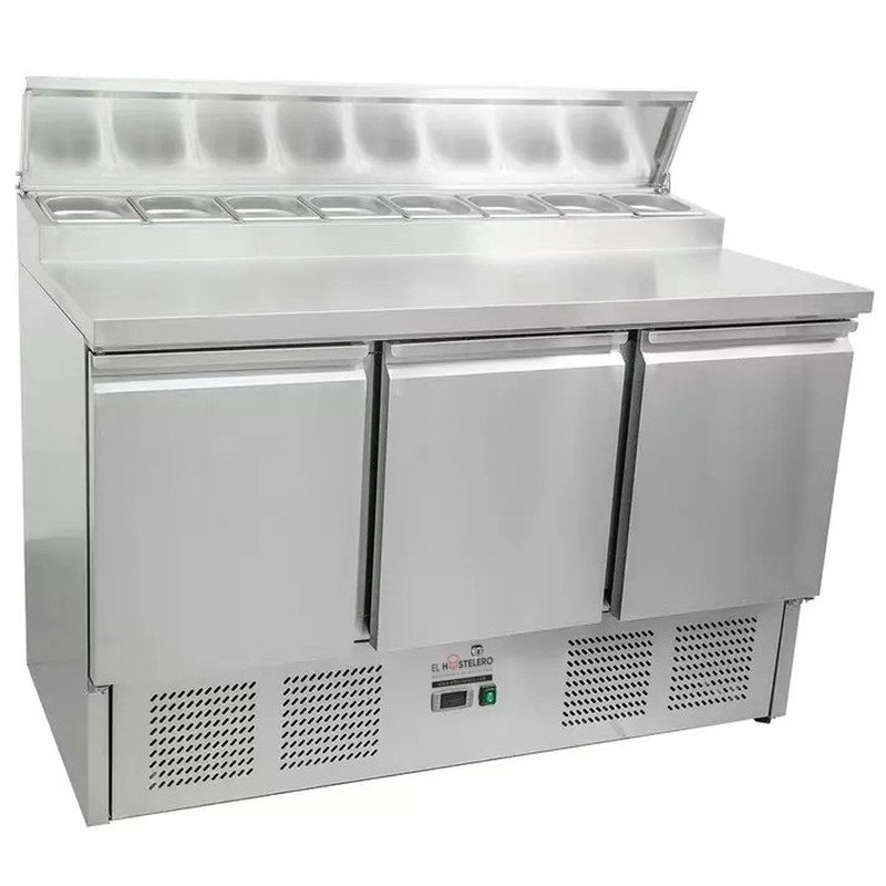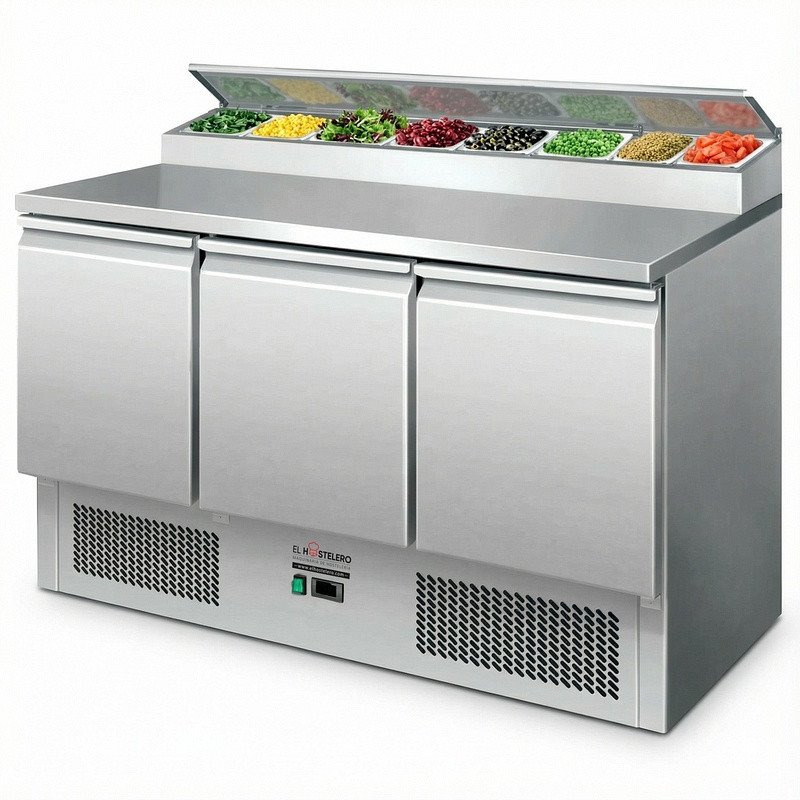 Mesa fría de 3 puertas para ensaladas con zona de ingredientes. Excelente relación calidad/precio. Fabricada en acero inoxidable en interior y exterior del mueble. Dotación de un estante y un conjunto de guías por cada puerta. Apto para cubetas GN1/6 de hasta 150 mm de profundidad (NO INCLUIDAS). Superficie de trabajo en acero inoxidable fácil de limpiar.