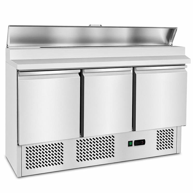 Mesa refrigerada de 3 puertas diseñada para la preparación de ensaladas con compartimento superior para ingredientes. Una opción práctica y funcional que destaca por su excelente relación calidad/precio, ideal para uso profesional.