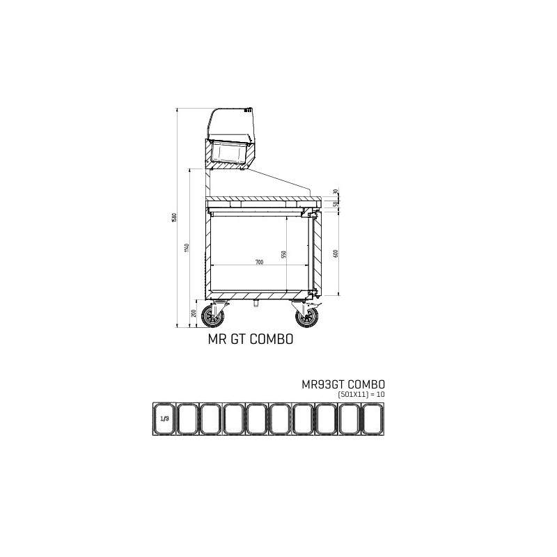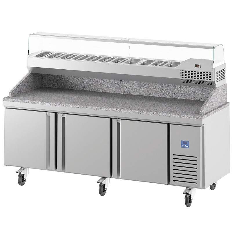 MESA REFRIGERADA PARA PIZZA 3 PUERTAS CON VITRINA FRÍA BANDEJAS GN 1/3 INFRICO MR 93 GT COMBO