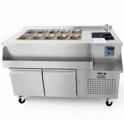Mesa coctelera refrigerada de 2 puertas fabricada en acero inoxidable, con capacidad para 10 cubetas GN 1/4 (no incluidas). Cuenta con refrigeración ventilada, termostato digital y desescarche automático. Incorpora grifo, fregadero, toma eléctrica frontal para conectar batidoras, ruedas para fácil movilidad, tabla de corte, herramienta lava-vasos y tuberías de agua.