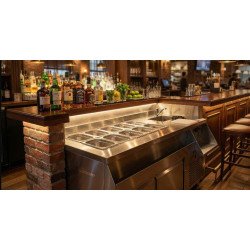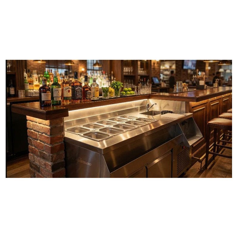✅ Zona superior de gran capacidad: Gran capacidad para alojar hasta 10 cubetas GN 1/4 (no incluidas), ideal para organizar frutas, salsas, toppings y todo lo necesario para la coctelería profesional. También es posible utilizar una parte de esta zona para alojar hielo.