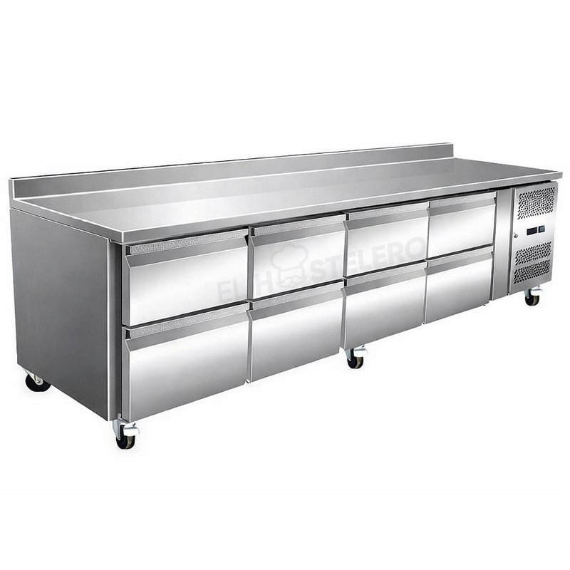 La mesa refrigerada profesional EHRCU2237-8 ofrece 8 cajones, refrigeración ventilada y gran rendimiento frigorífico, proporcionando almacenamiento refrigerado práctico y una sólida superficie de trabajo en acero inoxidable para cocinas profesionales.