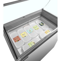 Vitrina para helados de gama económica con capacidad para 7 tarrinas de plástico de 5 litros. Esta vitrina para helados es perfecta si desea añadir la venta de helados de bola a su negocio sin incurrir en un importante gasto. Este modelo dispone de tapas deslizantes de cristal planas con cierre. Incluye soportes para cubetas. No incluye cubetas.