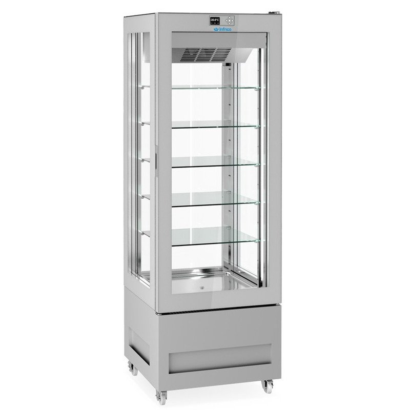 Expositor vertical ideal para pastelería y heladería, con temperatura ajustable de +5ºC a -20ºC. Estantes de cristal regulables en 5 niveles. Acabado en SILVER QUARTZ y 4 caras de cristal para una exhibición impecable.