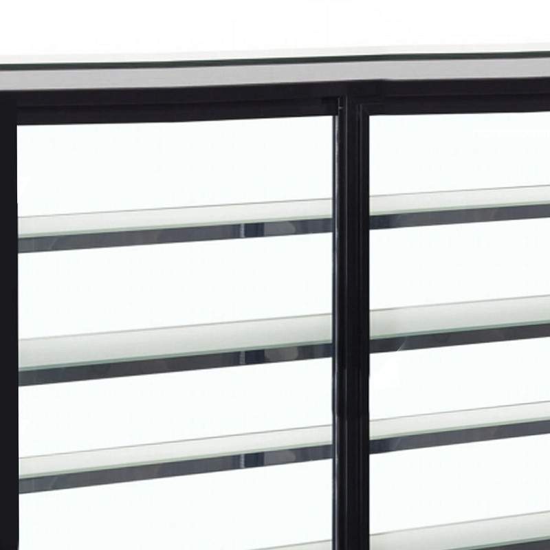 Mostrador frigorífico de exposición con sofisticado acabado en negro, ideal para realzar la presentación de alimentos y artículos de pastelería. Ofrece un consumo energético eficiente con clasificación D y cuenta con tres niveles de bandejas, más la base, que facilitan una disposición cómoda y bien organizada de los productos.