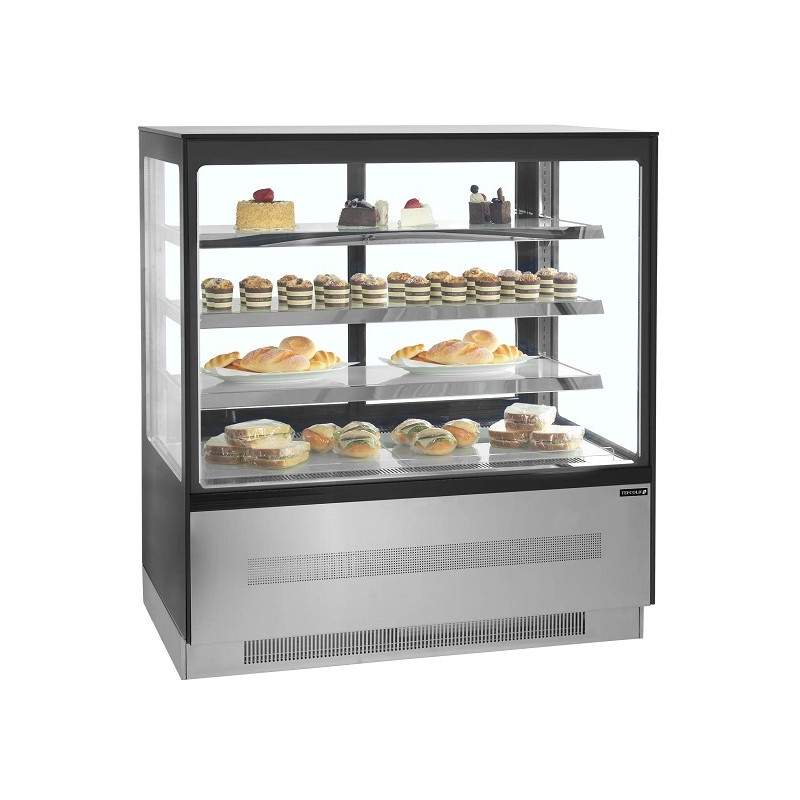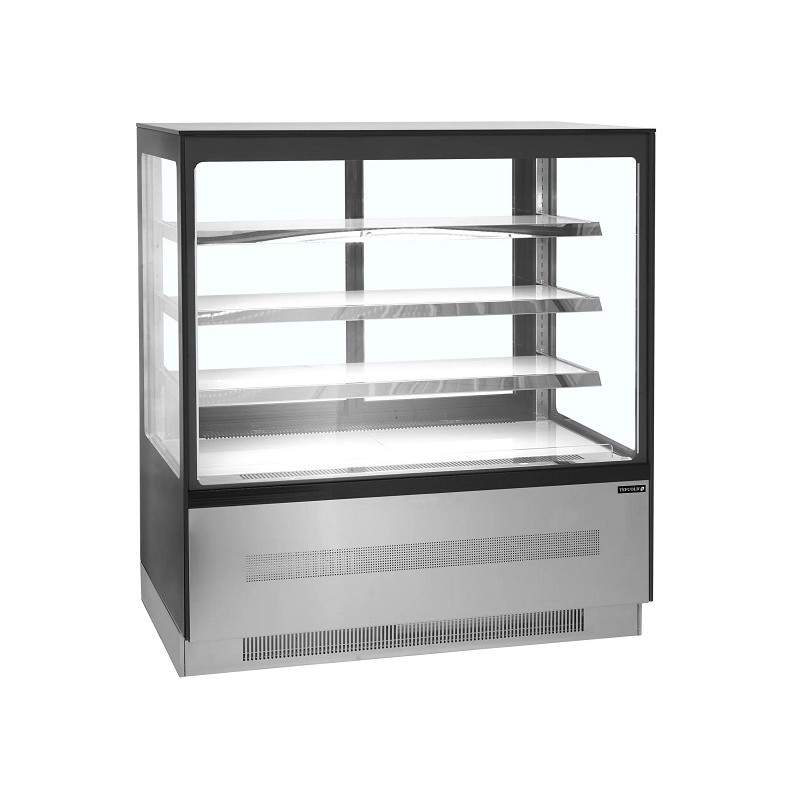 Vitrina refrigerada para exposición con un sofisticado acabado en color negro, ideal para realzar la presentación de alimentos y productos de pastelería. Su eficiencia energética, con clasificación D. Además, cuenta con tres estantes (sin incluir la base) para una mejor organización.