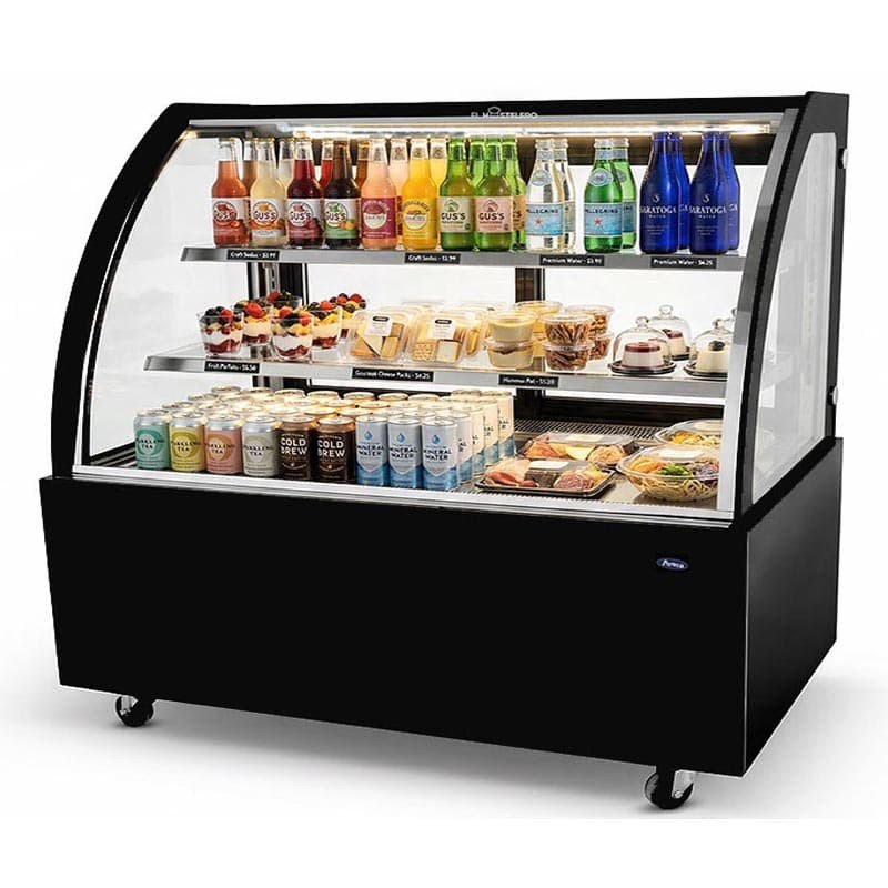 Vitrina negra expositora refrigerada de un metro y medio de ancho con un elegante acabado. Descubre nuestra vitrina expositora refrigerada en elegante negro, diseñada para resaltar la frescura y presentación de tus alimentos y pasteles. Cristal con resistencia anti-vaho. Con iluminación LED para una visibilidad impecable y eficiencia, combina estilo, funcionalidad y ahorro en un solo equipo. Dos estantes y tres niveles de exposición ¡Ideal para tu negocio!