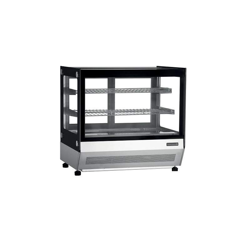 Expositor refrigerado de encimera, ideal para mostrar productos como bollería en espacios reducidos. Diseño elegante en acero inoxidable con puertas de cristal deslizantes y luz LED para mayor visibilidad. Refrigeración ventilada, control electrónico y bajo consumo energético.