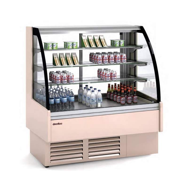 Vitrina expositora refrigerada de excelente diseño. Fabricada en España. Disponible en cualquier color disponible en la carta RAL. Sistema de refrigeración ventilada que proporciona una temperatura refrigerada homogénea en el interior del área de exposición. También disponible en versión para chocolates. Marca Docriluc.